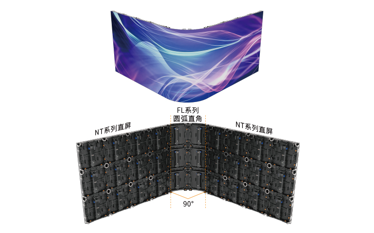 ⑤ 完美圓弧直角,轉(zhuǎn)角半徑更小:將FL系列2列箱體的角度調(diào)整成-45°后連接在一起,即可打造出90°圓弧直角,兩側(cè)建議拼接NT系列直屏,以節(jié)約購(gòu)屏成本。當(dāng)與NT系列互拼時(shí),只需向互拼屏發(fā)送一個(gè)配置文件即可,互拼屏顯示一致性效果更佳。